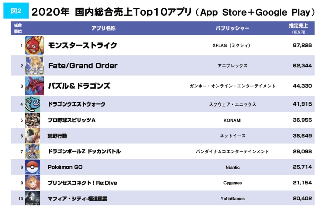 今回はその中から、ゲームアプリの「2020年国内総合売り上げ」ランキングを紹介します。2020年で最も売り上げが高かったアプリはなんだったのか、結果を見ていきましょう。