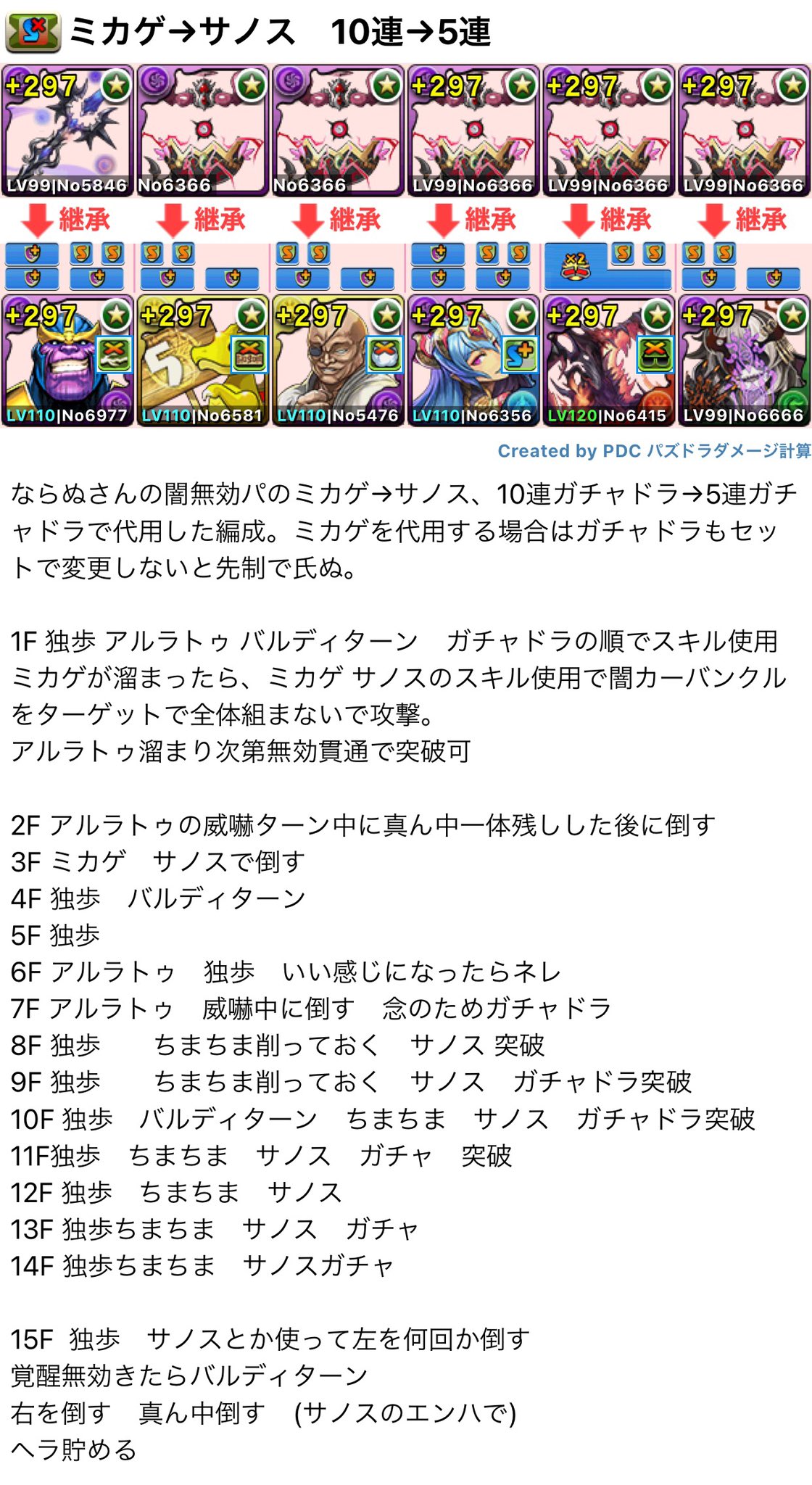 ならぬさんが闇無効パのミカゲ、10連ガチャドラをサノス、5連ガチャで代用した編成です。 pic.twitter.com/uQ99rB02gX