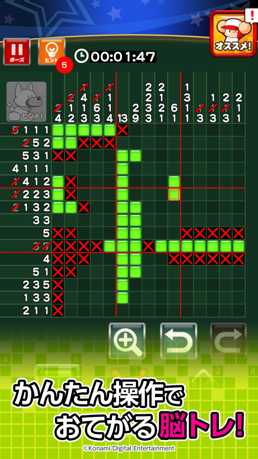 本作は,盤面の上と横に書かれた数字をヒントにマスを塗っていくロジックパズルゲーム。パズルを解くとピクセルアート(ドット絵)のパーツを獲得でき,それらがすべて揃うと「パワプロ」キャラクターのピクセルアートが完成するという。登場キャラクターは100名を超えるとのこと。