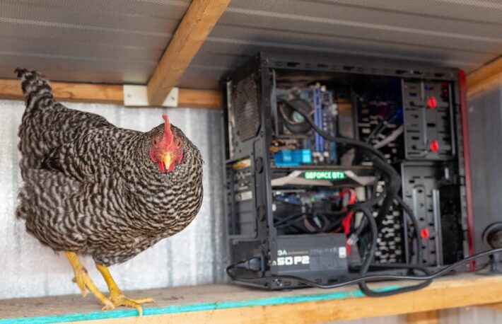 スミス氏は気づいた。スミス氏は今、飼育しているニワトリが夜、快適に過ごせるようマイニング装置の熱を使っている。