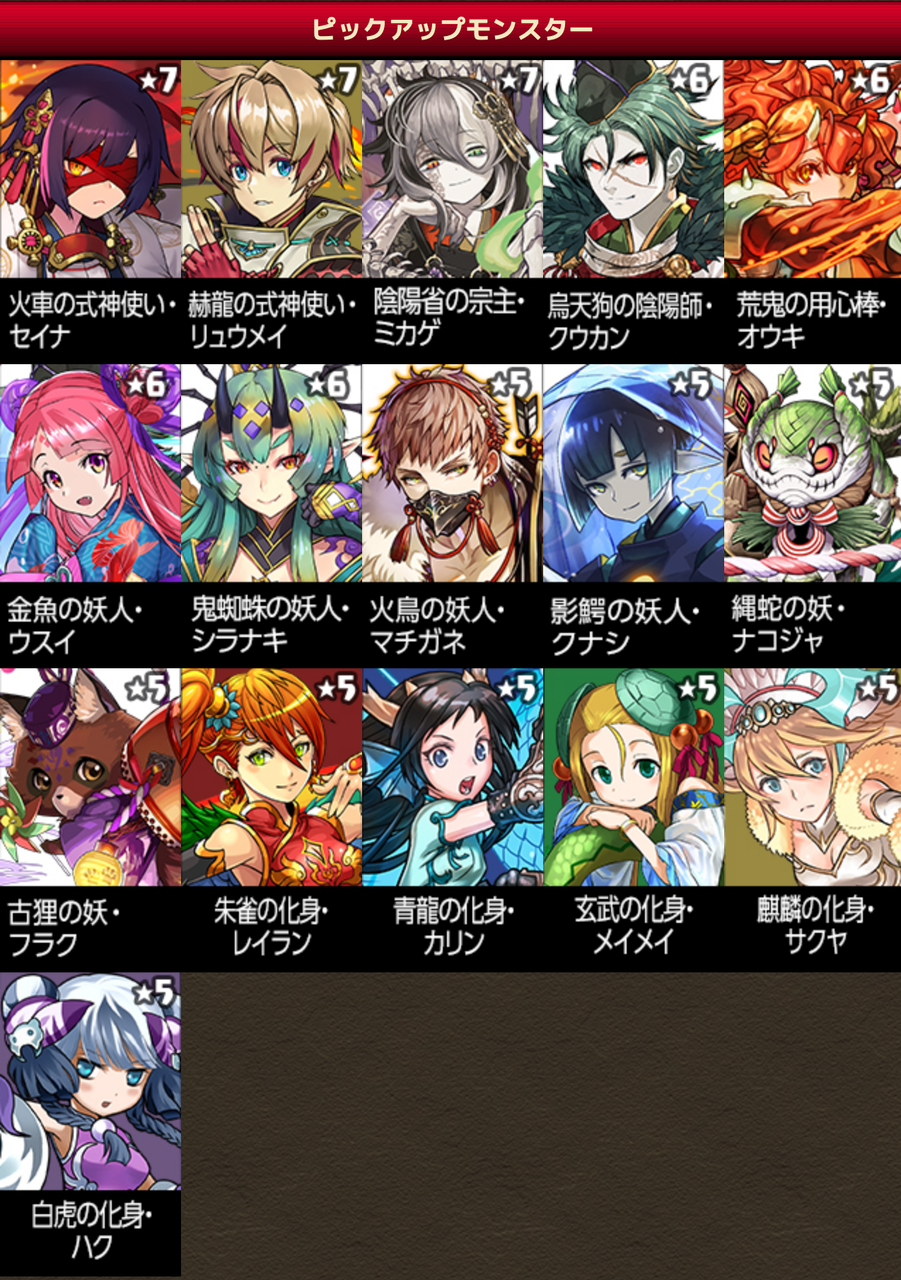 「陰陽省の宗主・ミカゲ」や「鬼蜘蛛の妖人・シラナキ」などの『式神使いと妖』イベントモンスターに加え、「玄武の化身・メイメイ」などの「四獣の神」シリーズをピックアップ!また「火車の式神使い・セイナ」、「赫龍の式神使い・リュウメイ」、「陰陽省の宗主・ミカゲ」は的中確率が1.5%になっているぞ!