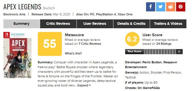 【悲報】Switch版『APEX LEGENDS』、メタスコア55点で終わる・・・ 2021/3/14 Y速報 " " 1: 2021/03/13(土) 19:30:18.07 ID:NT4fitN10 https://www.metacritic.com/game/switch/apex-legends 何故こんなことに…😧 続きを読む Source: Y速報