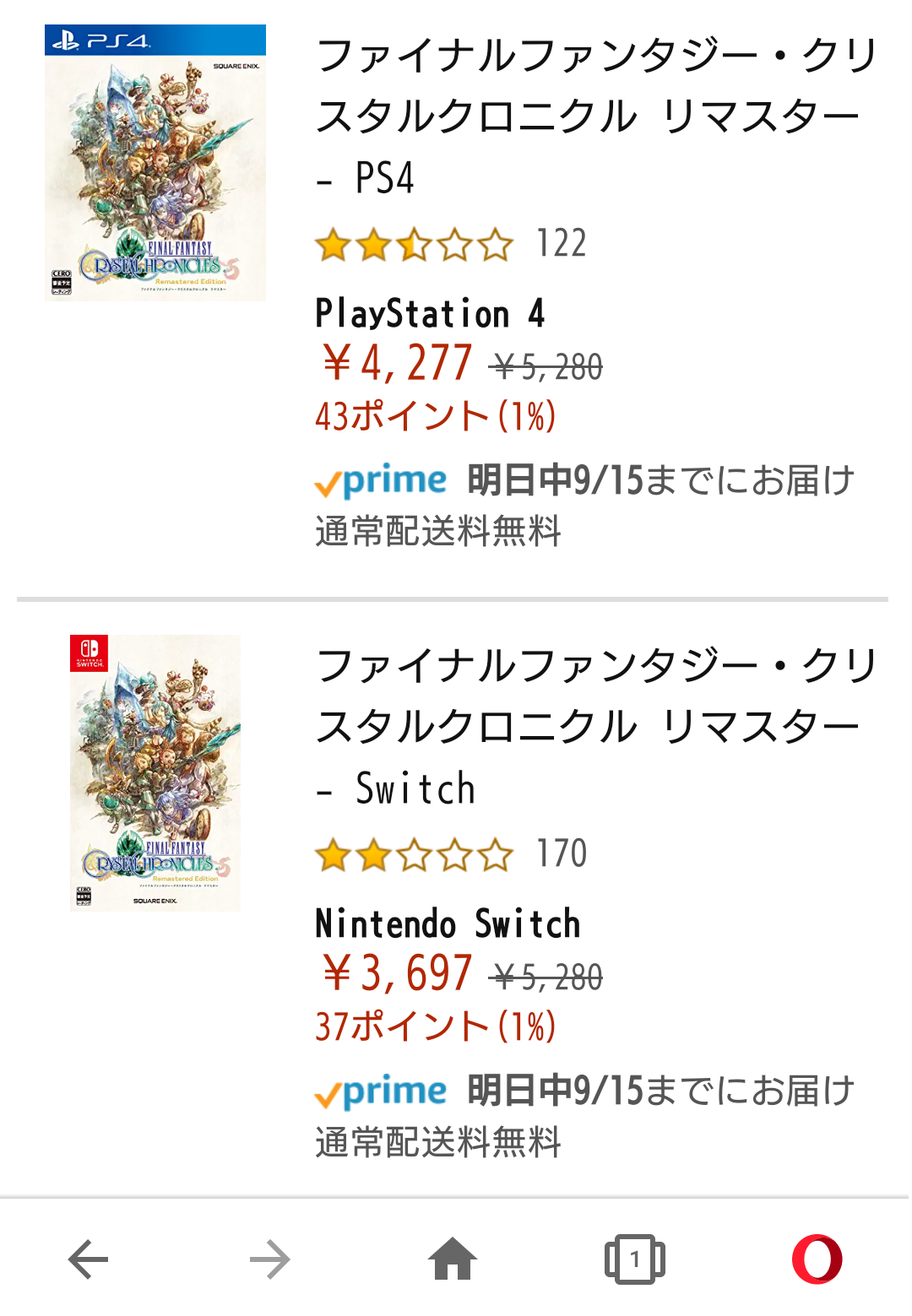 【悲報】Switch『FFCCリマスター』Amazonで値下がり始める… 2020/9/15 Y速報 " " 1: 2020/09/14(月) 19:03:40.78 ID:QZpxYQHy0 PS4版…通常販売価格 Switch版…3割引に下げて投げ売りスタート 続きを読む Source: Y速報