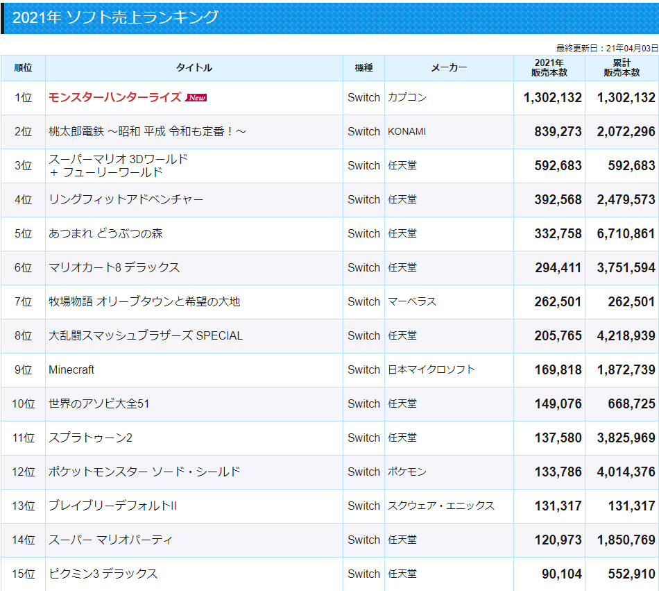 【衝撃】2021年ソフト売り上げランキング、TOP30をSwitchが独占!! 2021/4/4 Y速報 " " 1: 2021/04/03(土) 19:51:38.20 ID:rbtZaiZf0 ヤバすぎワロタwww https://teitengame.com/ 続きを読む Source: Y速報