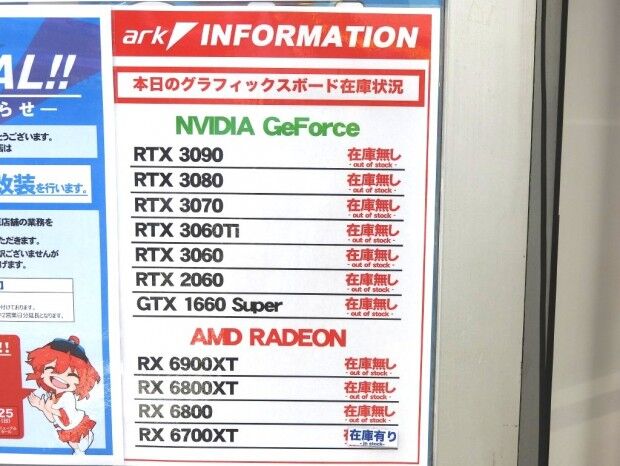 毎朝各ショップの店頭には、開店前から転売目的の人が行列しており、少量入荷されるGeForce RTX 3060/3070/3080は、陳列棚に並ぶ間もなく根こそぎ購入されていく状況。