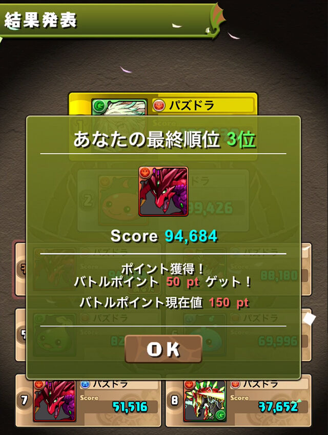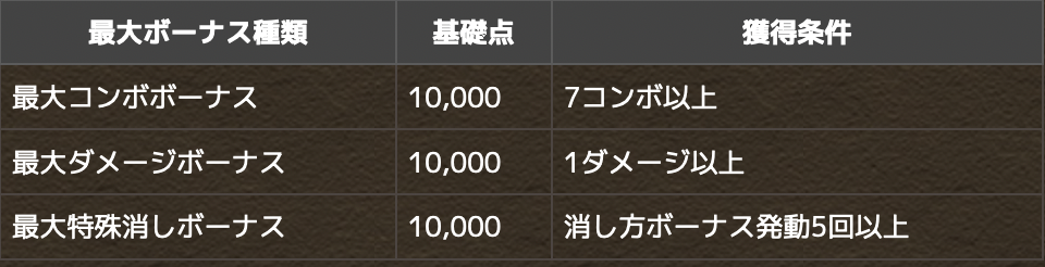 対戦に参加したプレイヤーの中で、最も高い「コンボ数」「ダメージ」「特殊消し回数」を出した場合、そのプレイヤーには結果発表時に「最大ボーナス」のスコアが加算されます。