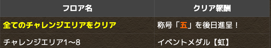 ・「チャレンジエリア」フロア全部で8つ隠されている高難易度のフロア!各フロアをクリアすると「イベントメダル【虹】」がゲーム内メールでゲットできるぞ!全ての「チャレンジエリア」をクリアしたユーザーには、「五」の称号を後日進呈!称号を目指して、ダンジョンに挑戦してみよう!