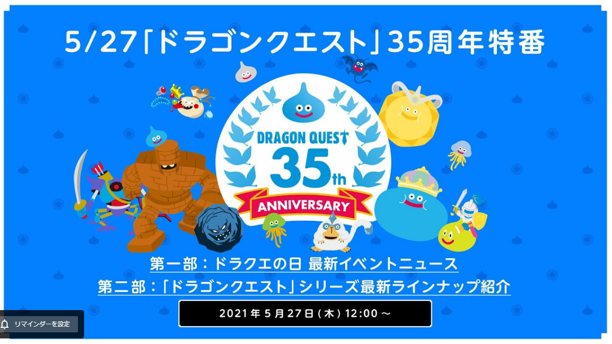 『ドラゴンクエスト』35周年記念特番が5月27日に放送決定!最新イベントニュースや最新ラインナップが公開 2021/5/13 PS5速報! " " 『ドラゴンクエスト』35周年記念特番が5月27日に放送!何かサプライズがあるかも…?! 続きを読む Source: PS4速報!