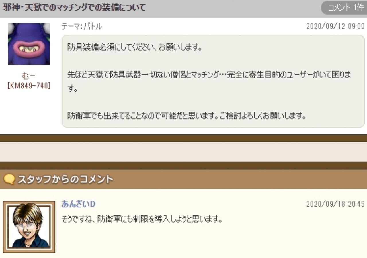 「天獄」で素っ裸に遭遇したことを問題にしてるのに対策で「防衛」に装備制限しますって書いたのがバカにされてるのでは…