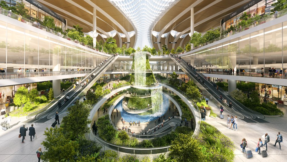 駅舎の中心には滝が流れる緑豊かで開放的な吹き抜け空間、そして駅前には広大な広場が!!