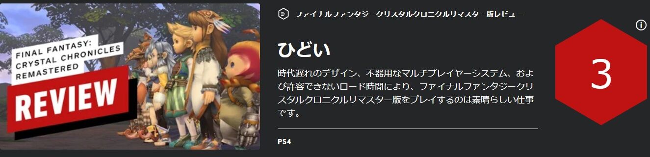 【悲報】FFCCリマスター、IGNレビュー3点 2020/8/27 Y速報 " " 1: 2020/08/27(木) 10:26:21.49 ID:mX6Fjt3Pp https://www.ign.com/articles/final-fantasy-crystal-chronicles-remastered-edition-review なおLEFT ALIVEは3.8点 続きを読む Source: Y速報