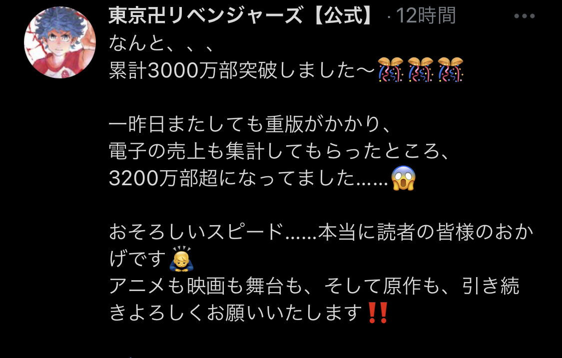 東京リベンジャーズ、累計発行部数3200万部突破wwww 2021/7/24 Y速報 " " 1: 2021/07/22(木) 07:05:48.67 ID:wRvjoQN/0 これ呪術倒すだろ 1億5000万部 鬼滅の刃 5000万部 呪術廻戦 3200万部 東京卍リベンジャーズ 1100万部 チェンソーマン 1000万部 スパイファミリー 続きを読む Source: Y速報
