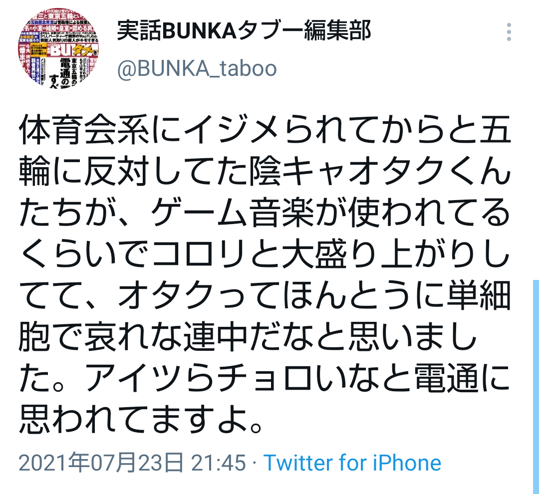 — 実話BUNKAタブー編集部 (@BUNKA_taboo) July 23, 2021