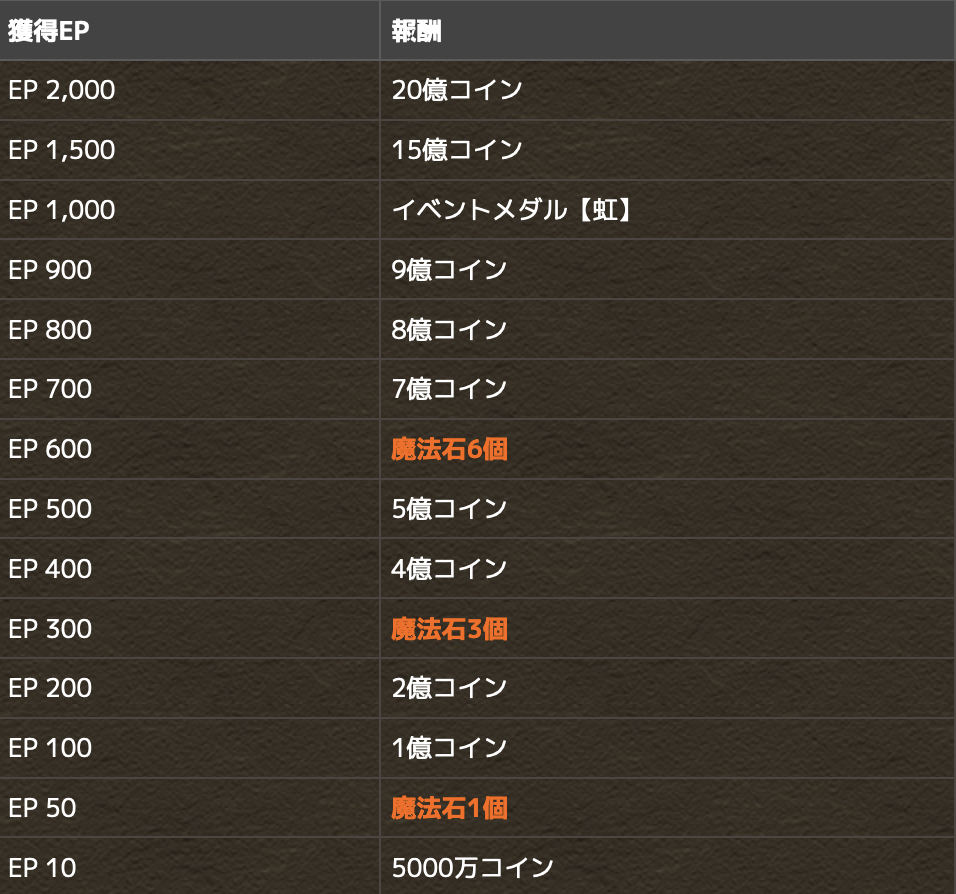獲得したEPはヴァルキリーカップのEPとして累積され、貯まったEPに応じて魔法石や大量のコインなどの「EP報酬」をゲットできるぞ!