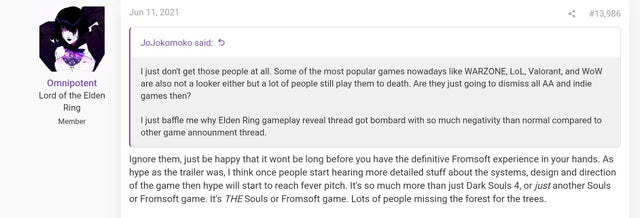 エルデンリングのゲームプレイ公開のスレッドが他のゲームの発表のスレッドに比べて通常より多くのネガティブな意見であふれているのは理解できない」