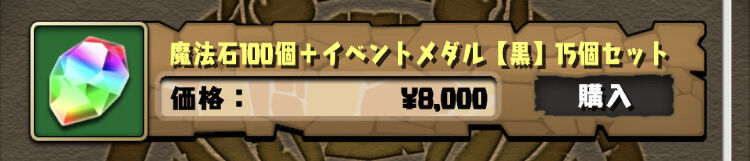 購入は1回限りで「魔法石100個+イベントメダル【黒】15個セット」(8,000円)を購入すると「魔法石100個」と「イベントメダル【黒】×15」が入手できる!