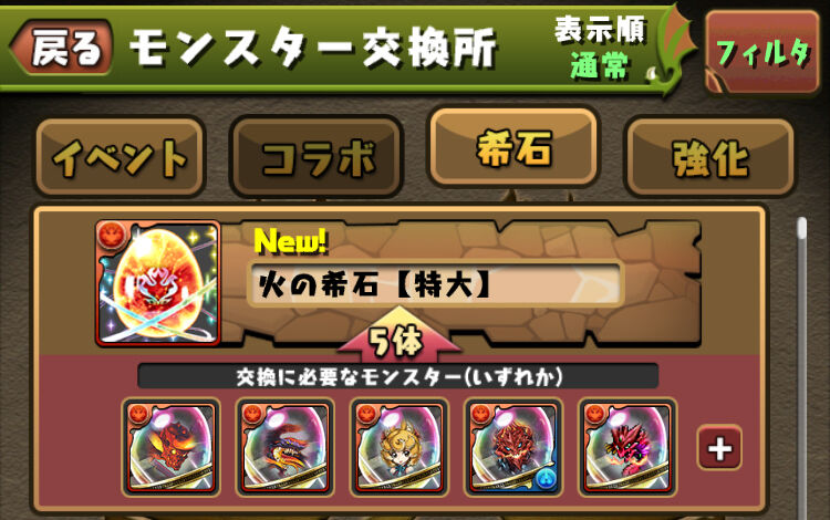 モンスター交換所の「希石」カテゴリに、5属性の「希石【特大】」が追加!