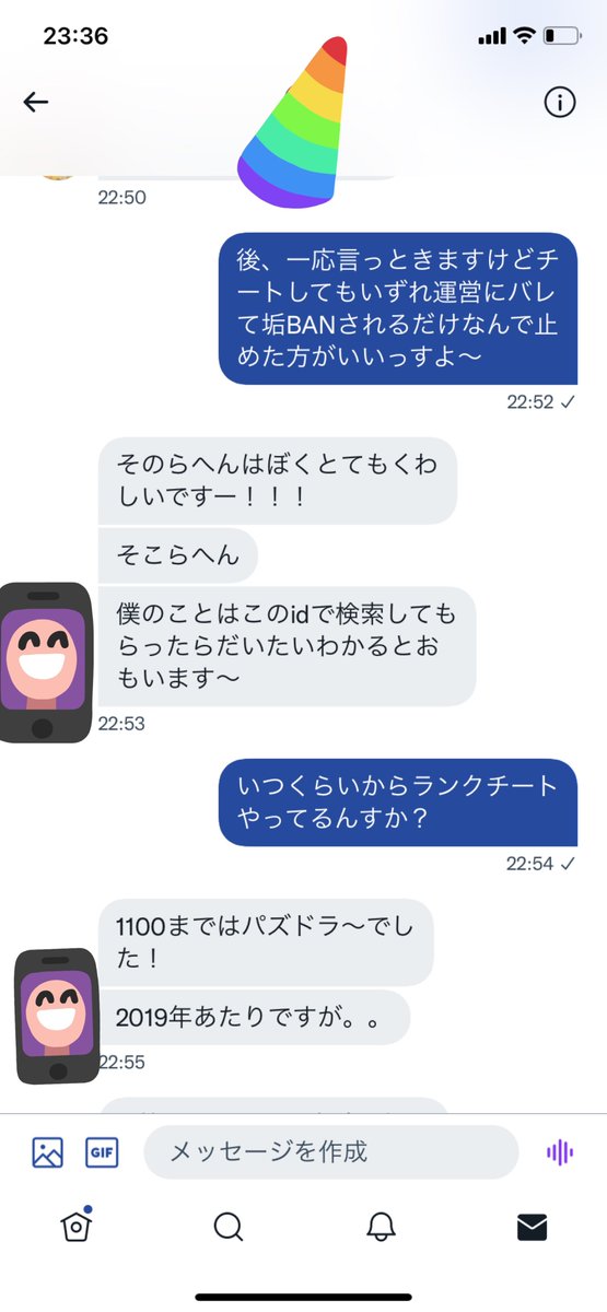 ランク1690のチーター本人からDMが来ました。かなり量が多かったので一部抜粋していただきます。 pic.twitter.com/Q8r3J0Yeo4